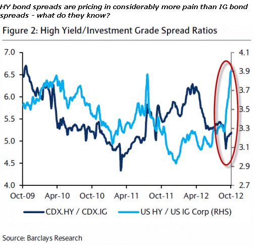 In other words, riskier bonds are pricing in far more pain than investment grade bonds.