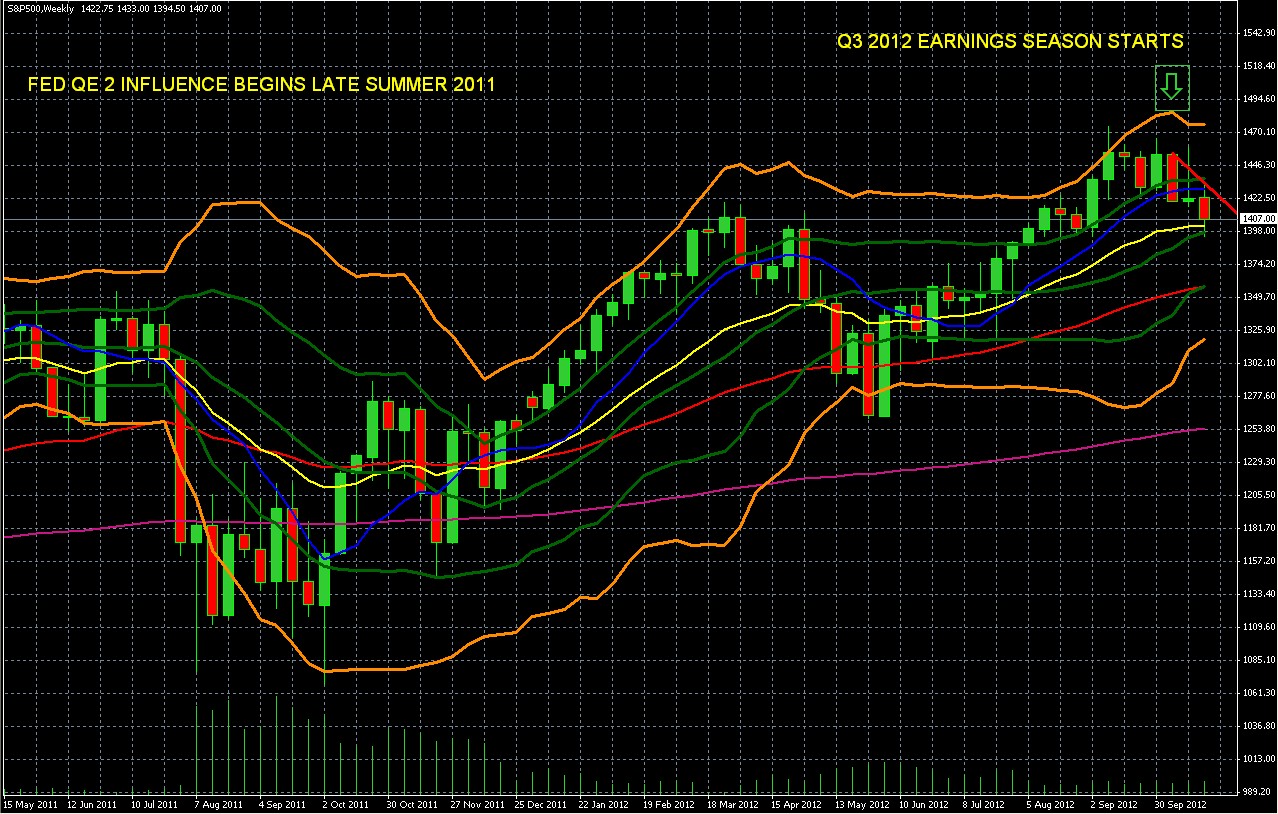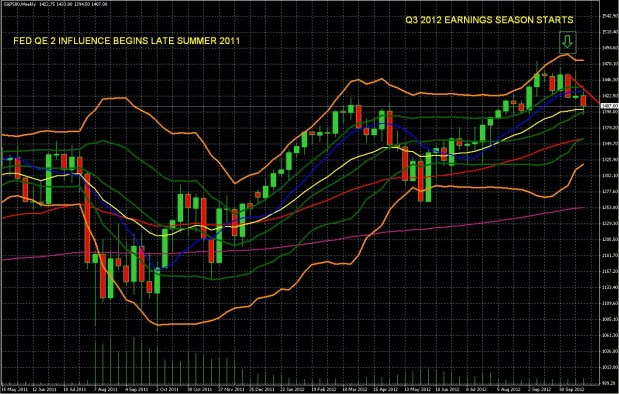 Over the past three weeks however, the reality of the global slowdown has forced its way back into market consciousness because it is now showing up in Q3 earnings reports. As the chart below shows, the bellwether S&P 500 has been pulling back since the start of Q3 2012 earnings season.