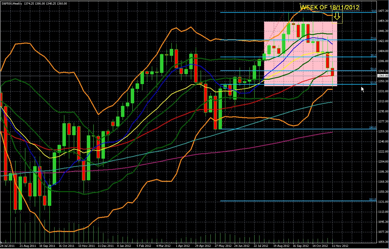 - The index is now at a major crossroads, with price sitting at the top of a major support zone of 1360-45, framed by the 50 week EMA (in red, also is a rough equivalent of the 200 day EMA) on top and the 61.8% Fibonacci Retracement (blue horizontal line highlighted by white arrow).