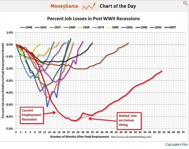 - Jobs Recovery Remains Weaker Than Believed: For example, Bill McBride of Calculated Risk posted his monthly chart that compares the current employment recovery versus that of earlier recessions and put its true weakness into perspective.