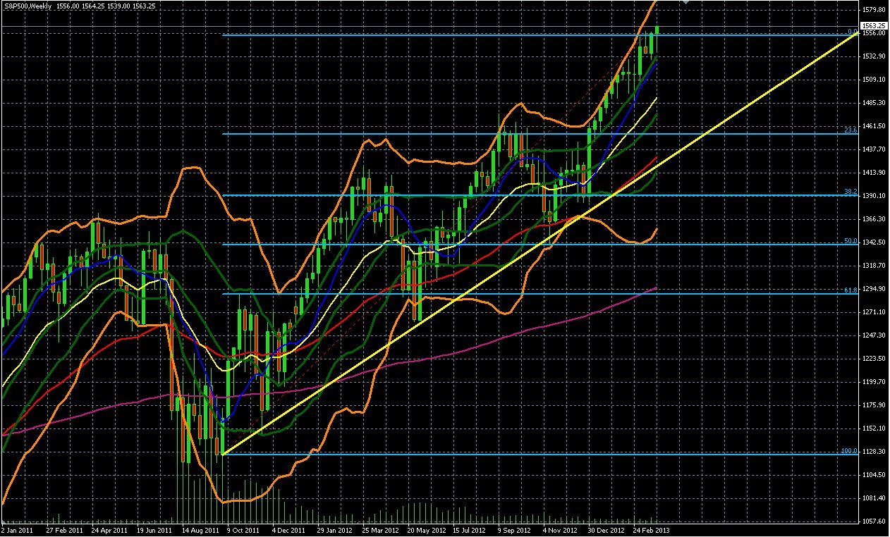 As in prior weeks, the weekly chart for the bellwether S&P 500 shows nothing but upward momentum.