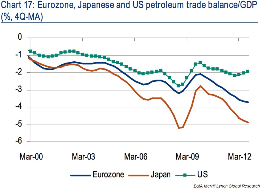 Per a report by currency strategist David Woo of BofA Merrill Lynch, “Going forward, it will be Europe rather than the U.S. that will have to bear the brunt of the cost associated with the growing number of Chinese and Indian consumers and their appetite for energy.”