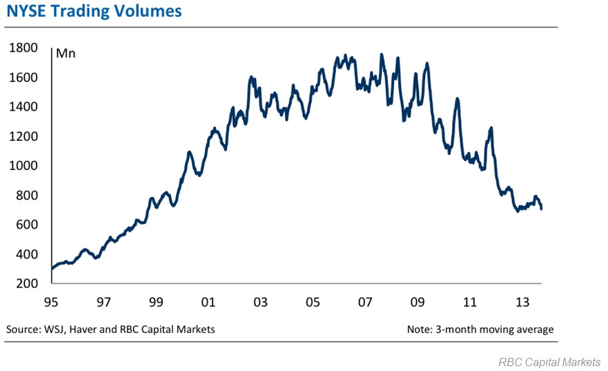 Trading volumes continue to trend lower throughout the rally that began in 2009, and those volumes continue to fall in 2012-3, suggesting a lack belief in the rally, and thus of new buyers to fuel further gains, despite the recent record highs.
