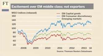 In the charts below, Authers uses the MSCI capital goods indexes as rough but still useful proxy for EM exporters, and the MSCI EM consumer discretionary index to represent that sector.