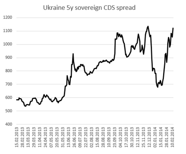 The chart below shows the rising cost to of default insurance on Ukraine 5 year notes.