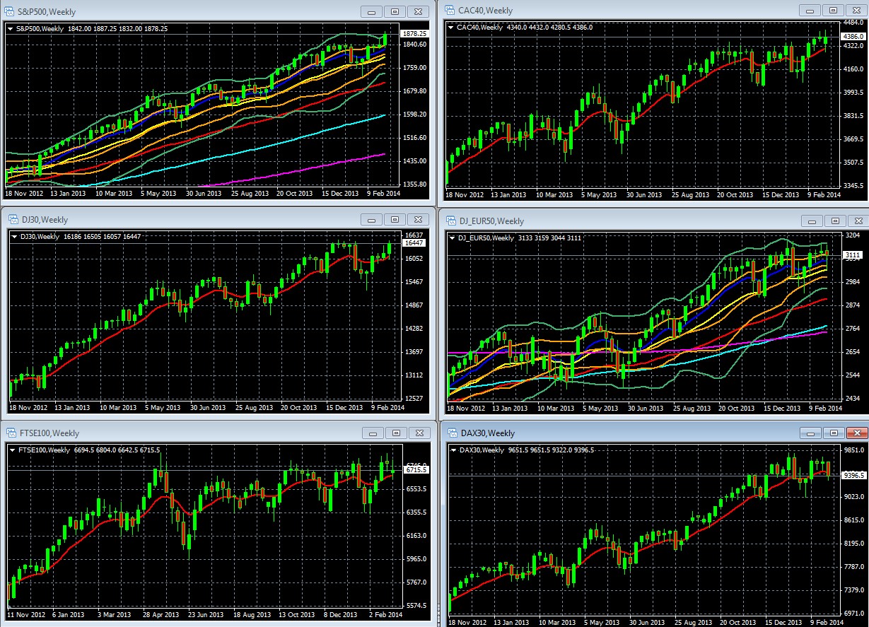 FOR S&P 500 AND DJ EUR 50 Weekly Chart October 2012 – Present: 10 Week EMA Dark Blue, 20 WEEK EMA Yellow, 50 WEEK EMA Red, 100 WEEK EMA Light Blue, 200 WEEK EMA Violet, DOUBLE BOLLINGER BANDS: Normal 2 Standard Deviations Green, 1 Standard Deviation Orange