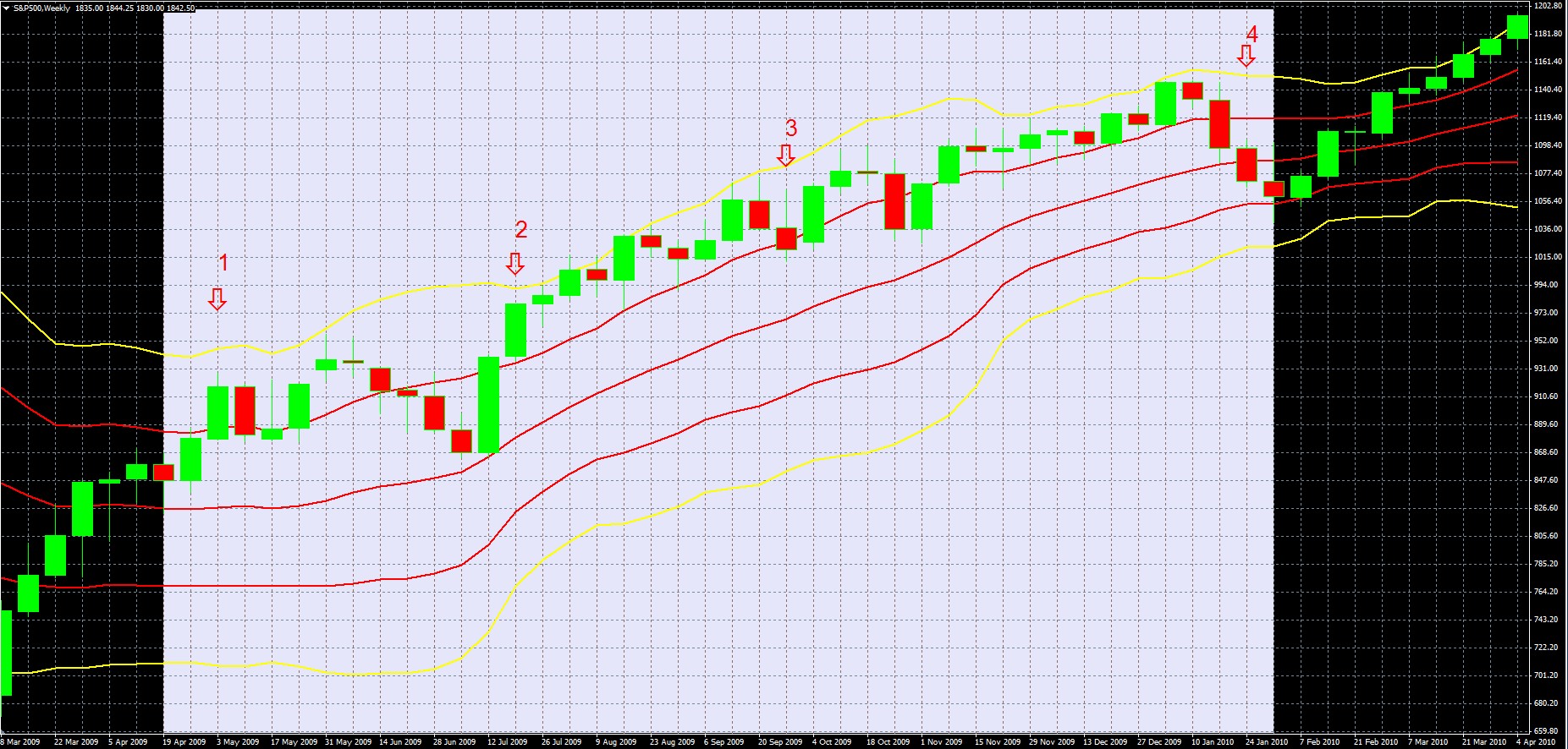 For example, look at the SP 500 index weekly chart below (Chart 5), in which we zoom in on the section of Chart 2 above that covers the period from May 3, 2009, to January 24, 2010 highlighted by arrows 1-4.