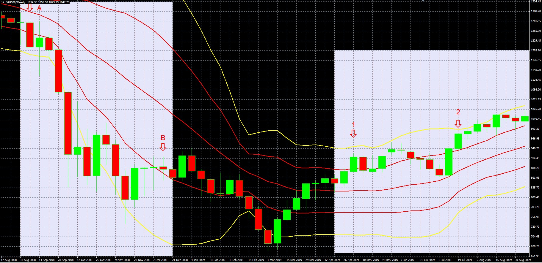 CHART 1: S&P 500 Weekly Chart Sept. 7th – Dec. 14th 2008 – SELL ZONE Framed By Arrows A and B Within Highlighted Area