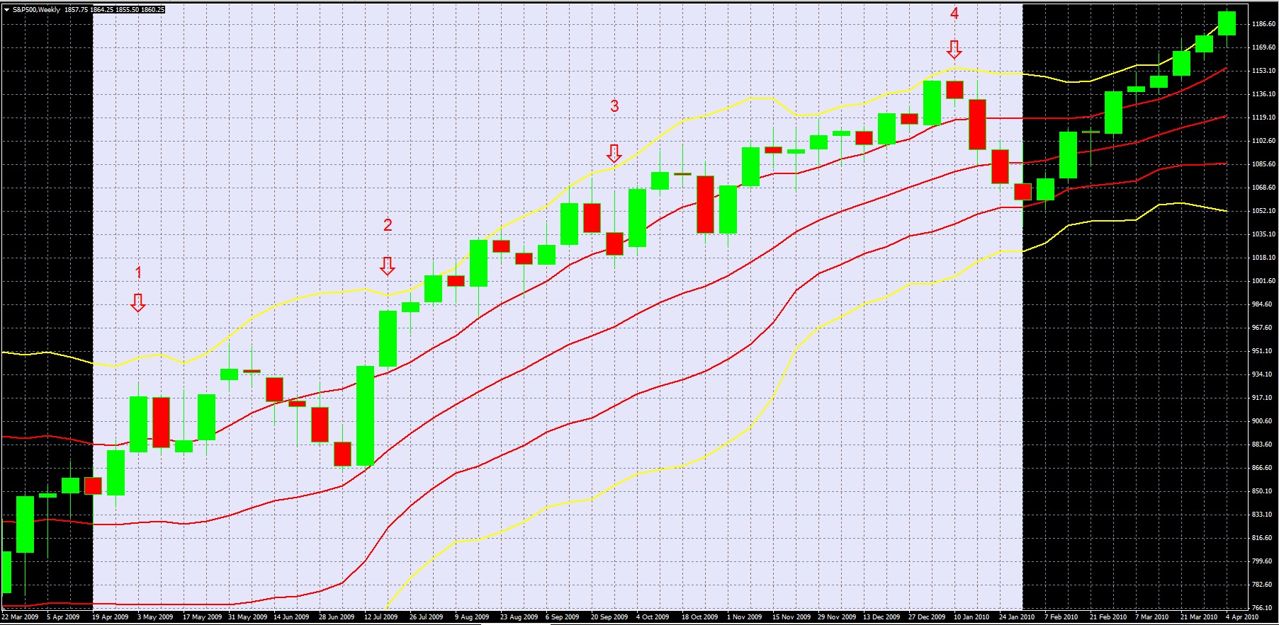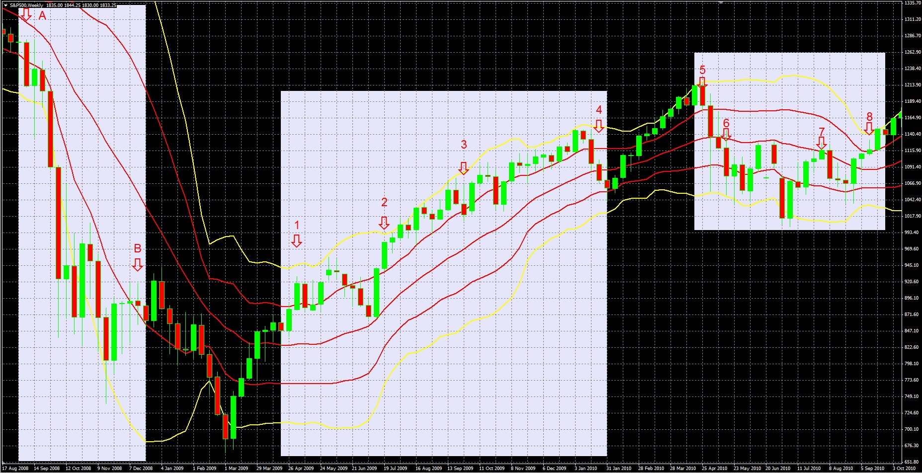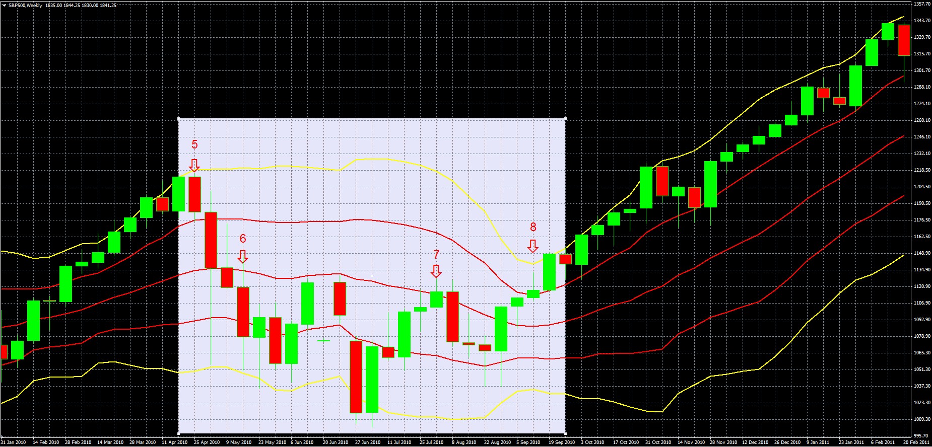Red Arrows Highlighting weekly candles of April 25 (5), 2010, May 16, (6), August 1 (7), Sept. 12 2010 (8)