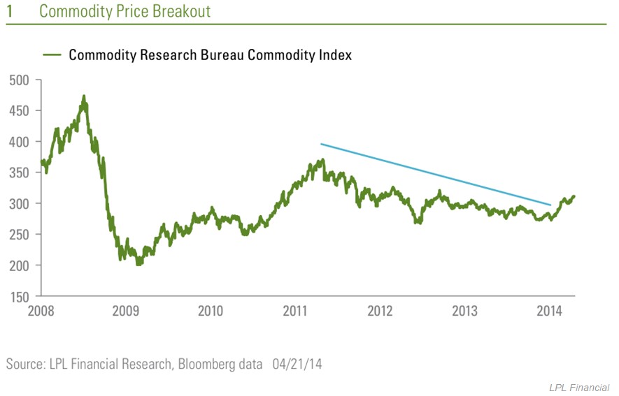 - After dropping for three years, commodity prices, measured by the Commodity Research Bureau Commodity Index, appear to have started to rebound, as shown in the chart below. Food prices are rising in part due to the extended effects of severe weather, both cold and drought. Fuel prices have also been rising — with gasoline prices up 45 cents in the past five months to a national average of $3.65 per gallon.