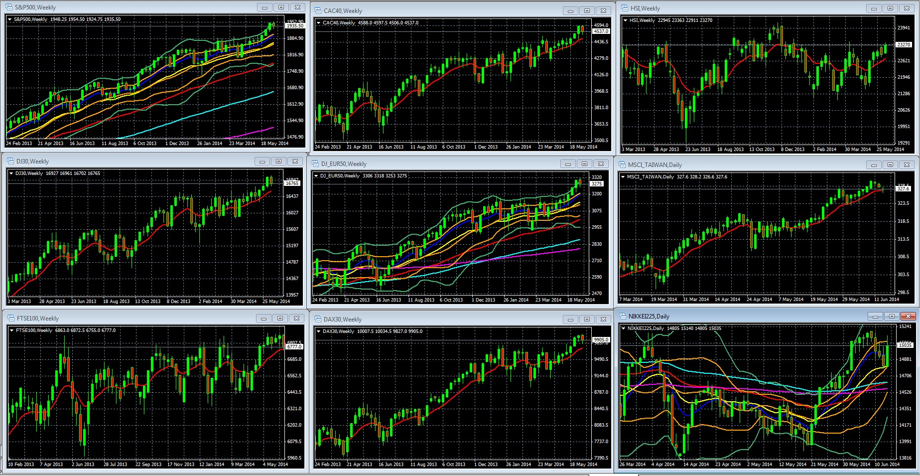 Weekly Charts Of Large Cap Global Indexes Feb 24 2013 To Present With 10 Week/200 Day EMA In Red: LEFT COLUMN TOP TO BOTTOM: S&P 500, DJ 30, FTSE 100, MIDDLE: CAC 40, DJ EUR 50, DAX 30, RIGHT: HANG SENG, MSCI TAIWAN, NIKKEI 225