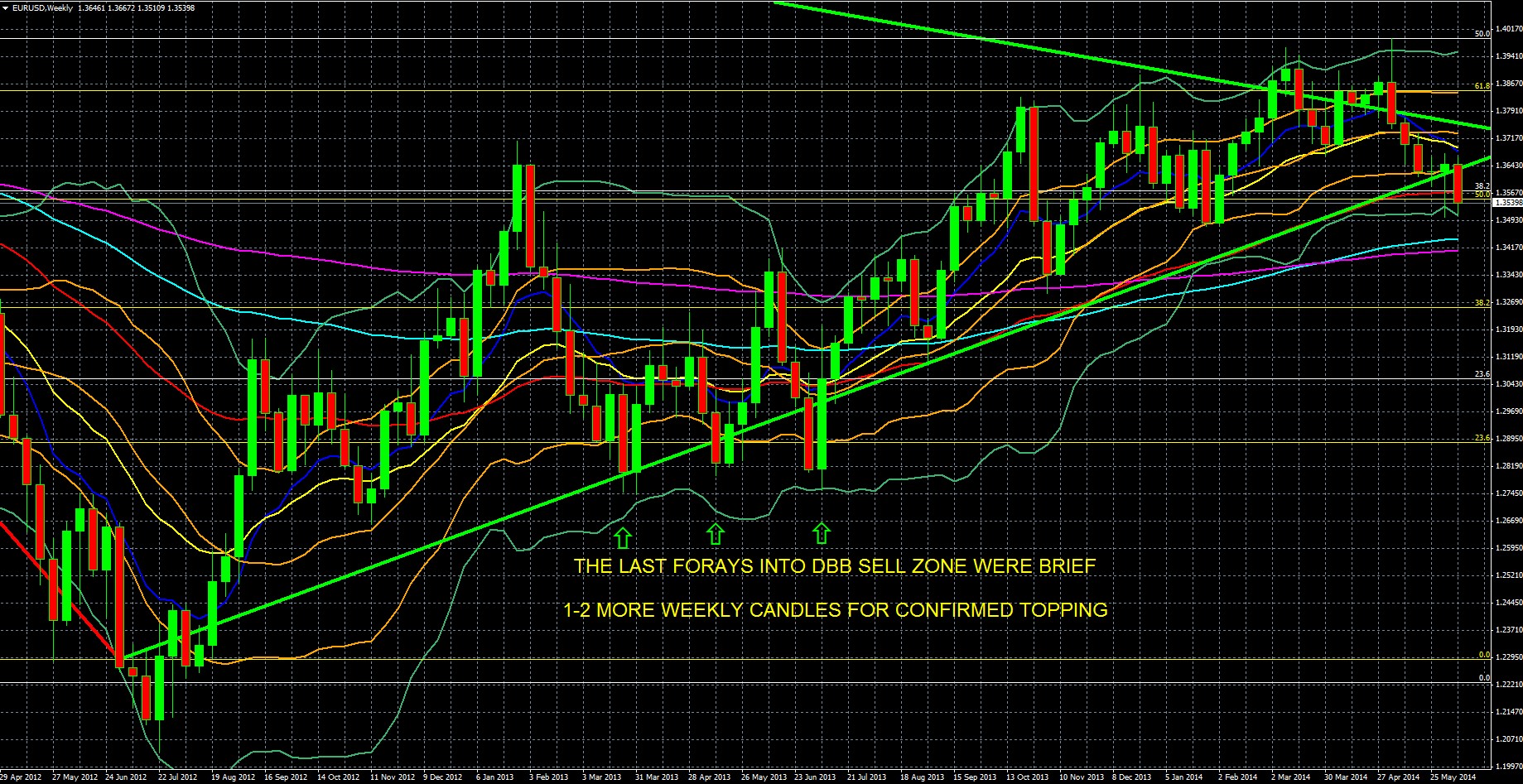 KEY: 10 Week EMA Dark Blue, 20 WEEK EMA Yellow, 50 WEEK EMA Red, 100 WEEK EMA Light Blue, 200 WEEK EMA Violet, DOUBLE BOLLINGER BANDS: Normal 2 Standard Deviations Green, 1 Standard Deviation Orange. Green downtrend line from EURUSD peak of July 2008 to present, green uptrend line from August 2012 to present. White Fibonacci retracement lines for downtrend of August 2008 To June 2010, yellow Fibonacci retracement lines for downtrend of May 2011 To July 2011.