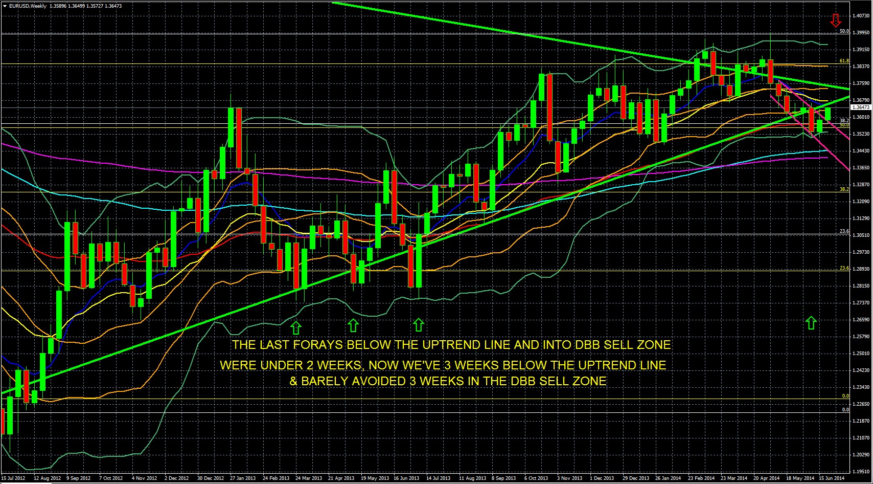 KEY: 10 Week EMA Dark Blue, 20 WEEK EMA Yellow, 50 WEEK EMA Red, 100 WEEK EMA Light Blue, 200 WEEK EMA Violet, DOUBLE BOLLINGER BANDS: Normal 2 Standard Deviations Green, 1 Standard Deviation Orange. Green downtrend line from EURUSD peak of July 2008 to present, green uptrend line from August 2012 to present. White Fibonacci retracement lines for downtrend of August 2008 To June 2010, yellow Fibonacci retracement lines for downtrend of May 2011 To July 2011.