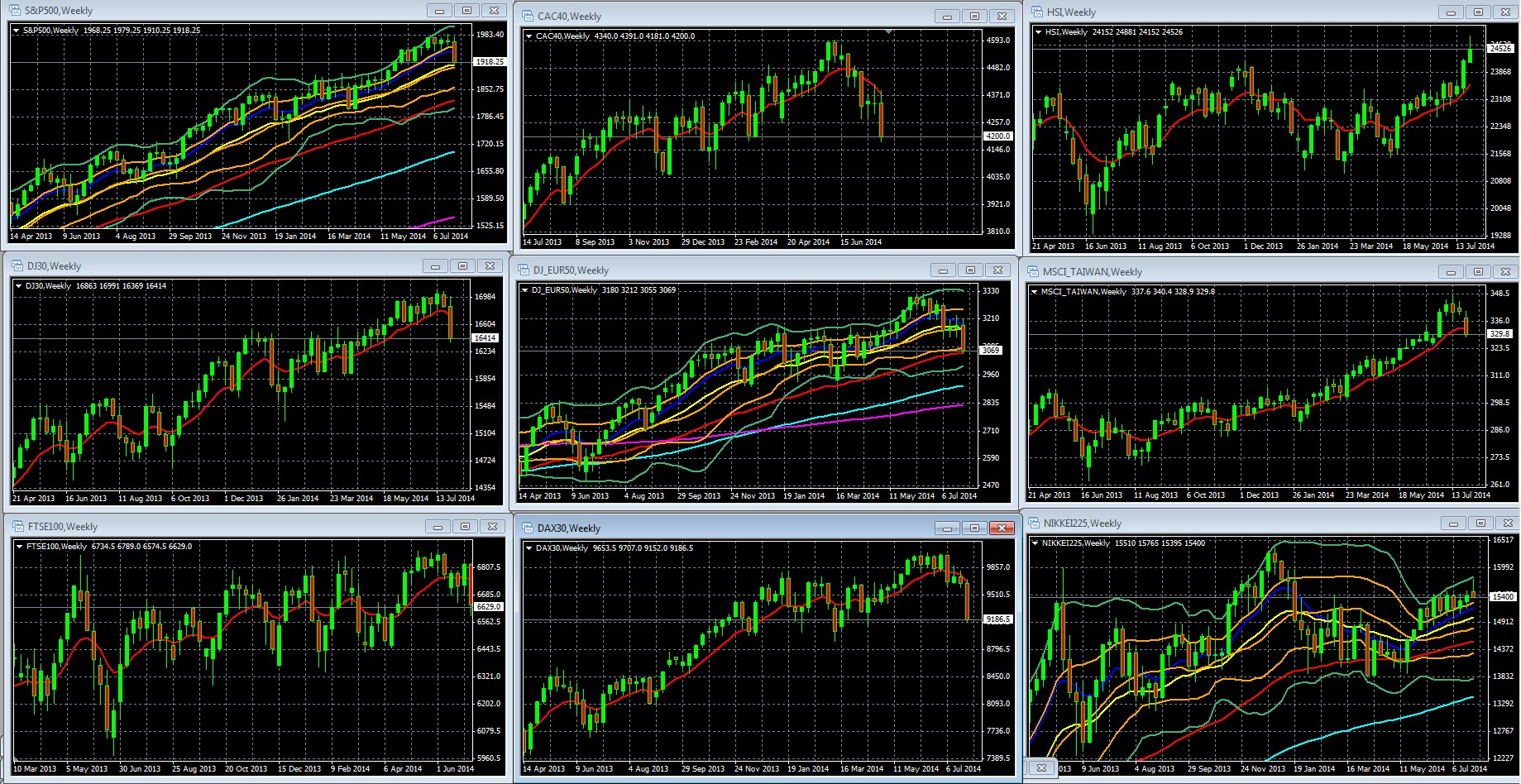 Key For S&P 500, DJ EUR 50, Nikkei 225 Weekly Chart: 10 Week EMA Dark Blue, 20 WEEK EMA Yellow, 50 WEEK EMA Red, 100 WEEK EMA Light Blue, 200 WEEK EMA Violet, DOUBLE BOLLINGER BANDS: Normal 2 Standard Deviations Green, 1 Standard Deviation Orange.