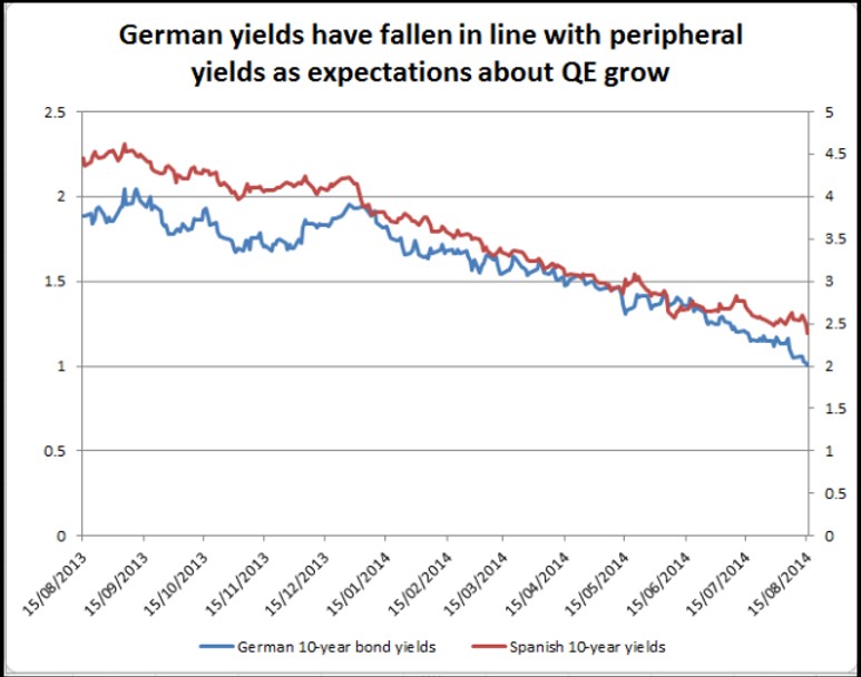 In other words, falling German yields could be attributed to simple safe-haven demand. However the fact that other, less credit worthy nations are also seeing falling yields suggests something other than flight to safety demand – that QE expectations are rising.