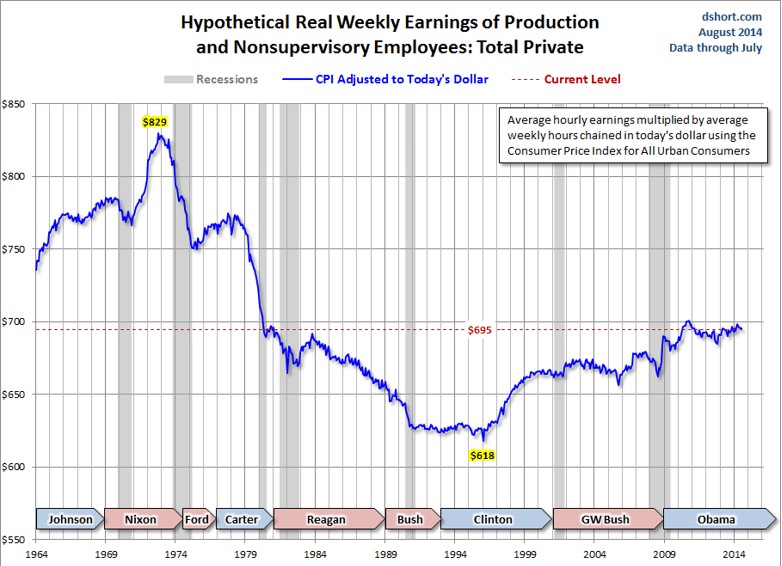 Doug Short’s Five Decades of Middle Class Wages details how US incomes have fared over the past decades (before taxes) once we factor in inflation and declining hours per week. This chart sums it up.