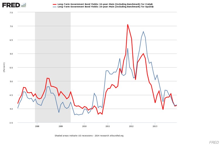 Italy is moving very slowly with reforms, but it doesn’t have the luxury of time, because markets will soon realize that it will ultimately default unless someone buys Italian bonds in order to keep Italy’s borrowing costs low – a European style QE currently illegal per the EU’s Maastricht treaty which forbids ECB funding of member states’ debt. However it’s unlikely that Italy can convince Germany, and other nations that would fund the ECB’s bond buying, that Italy could ever repay the ECB.