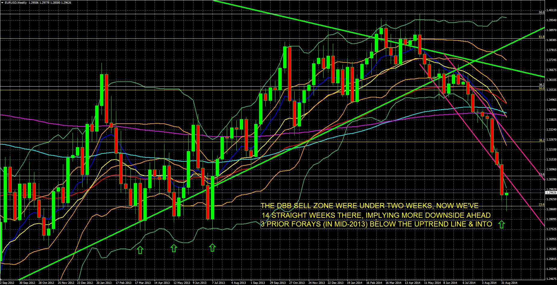KEY: 10 Week EMA Dark Blue, 20 WEEK EMA Yellow, 50 WEEK EMA Red, 100 WEEK EMA Light Blue, 200 WEEK EMA Violet, DOUBLE BOLLINGER BANDS: Normal 2 Standard Deviations Green, 1 Standard Deviation Orange. Green downtrend line from EURUSD peak of July 2008 to present, green uptrend line from August 2012 to present. White Fibonacci retracement lines for downtrend of August 2008 To June 2010, yellow Fibonacci retracement lines for downtrend of May 2011 To July 2011.